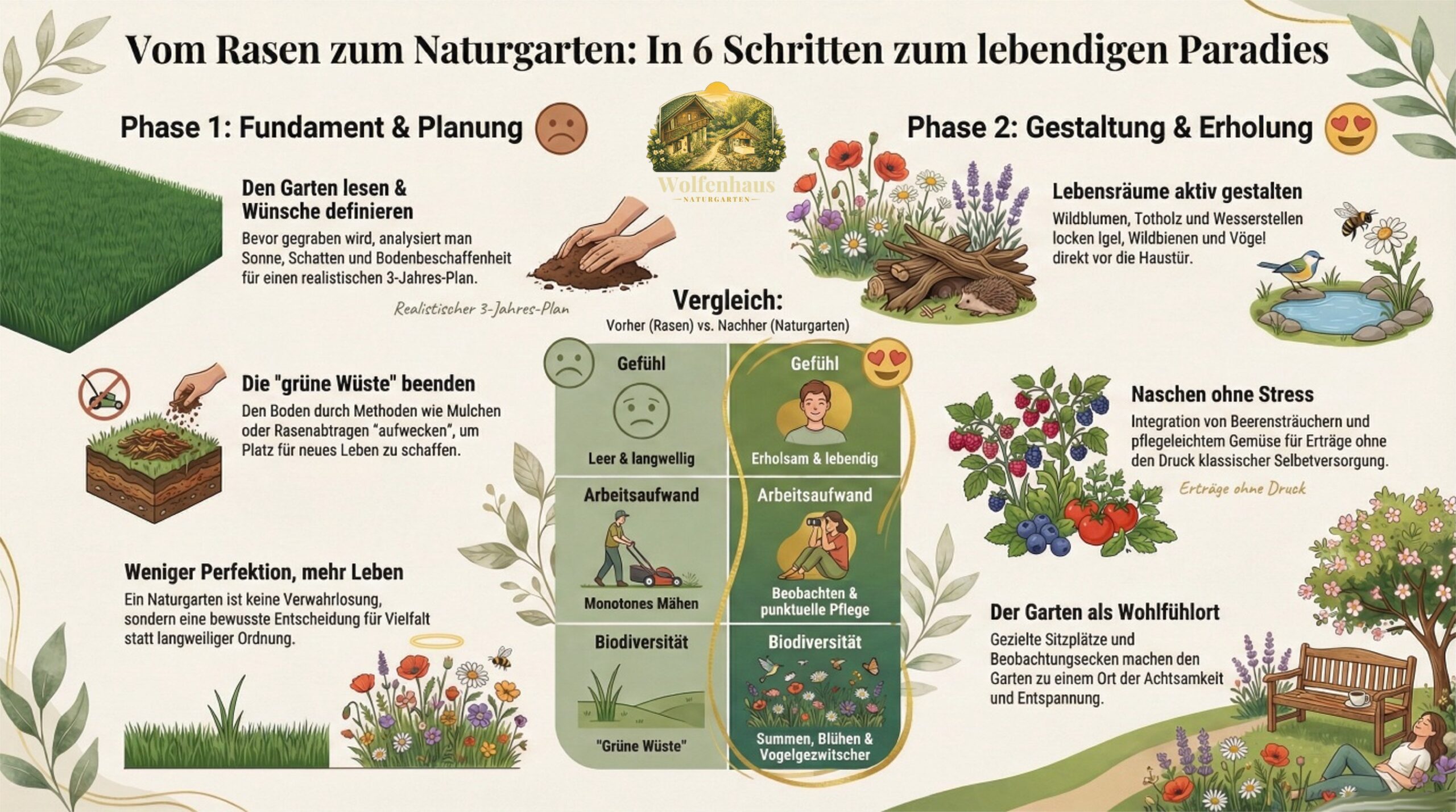 Boden testen, Zonen definieren (Erholung, Wildnis, Naschen) und einen realistischen 3-Jahres-Plan aufstellen. Nichts überstürzen!