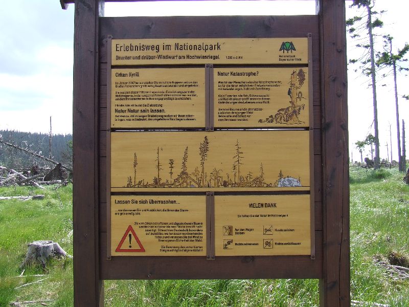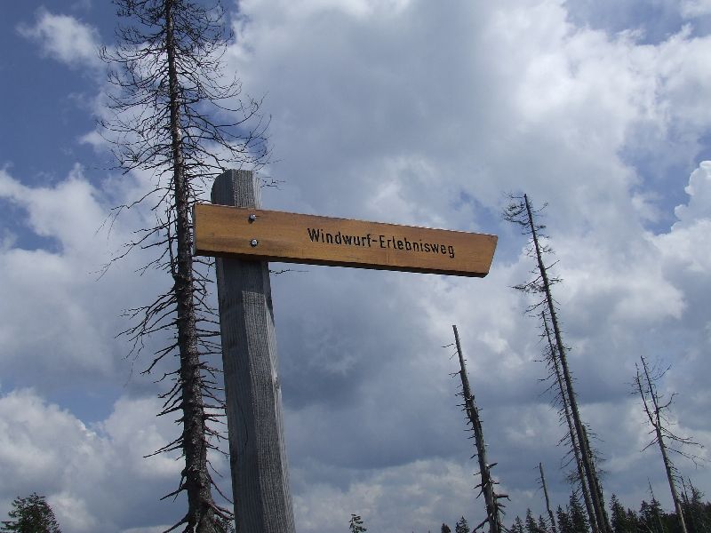 Nun geht es weiter steinig hinauf bis zu den Windwurfflächen und dem Windwurferlebnisweg, wo der Sturm die Bäume wie Zündhölzer gebrochen hat und sie kreuz und quer in der Landschaft liegen.